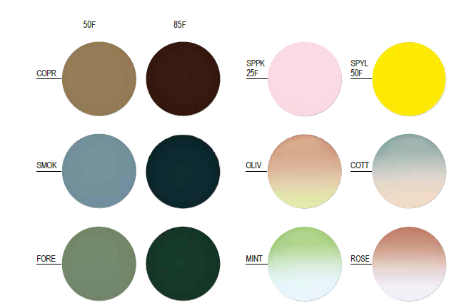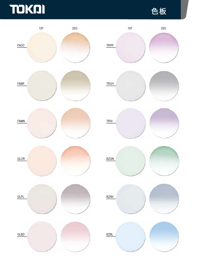 TOKAI東海光學(xué)具有可靠的染色技術(shù),純色染色鏡片與漸變?nèi)旧R片都有相應(yīng)的顏色色板。且TOKAI東海光學(xué)的顏色可選范圍很廣,染色深度可以覆蓋從淺到深的范圍,適用于從室內(nèi)到戶外條件下的佩戴需要。