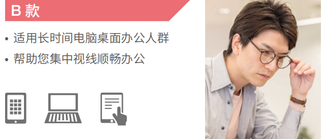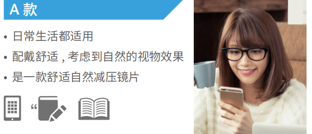 REST-W 雙面減壓鏡片,還根據(jù)不同的場景,不同的人群,不同的訴求,設(shè)計(jì)了兩款不同的下加光:A款 0.50D和B款 0.75D。A款適合日常生活,B款則更適合長時間集中視線在辦公桌前的白領(lǐng)。兩款不同的設(shè)計(jì)滿足特殊場景的具體需求。